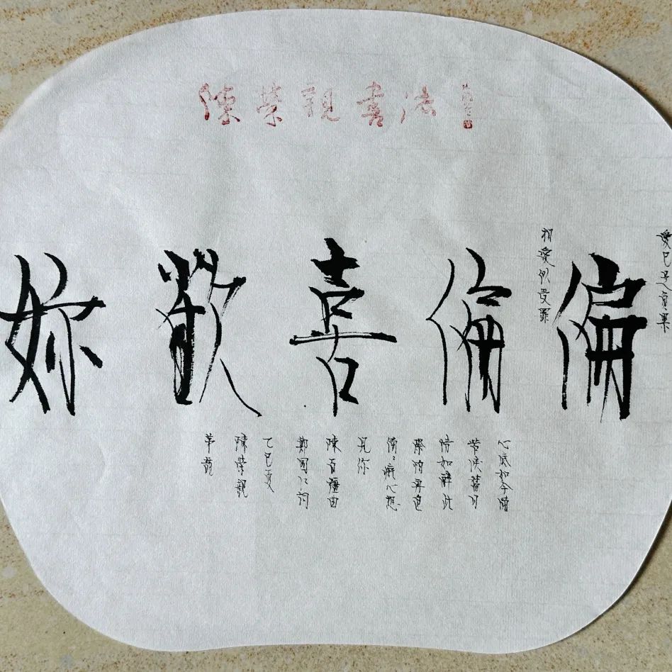 笔底波澜,皆是心声。陈荣亲先生以纯粹的赤子之忱和深厚的艺术功力,让陈百强的歌声在墨香中永恒回荡。白宣与仿古宣上跳跃的墨迹,是他以心织就的乐章。取法欧阳询行书的风骨,又暗藏宋徽宗瘦金体的清雅意趣。字字如珠,结构严谨却气韵开阔;笔笔中锋,纤细线条竟蕴藏钢丝般的柔韧张力。传统章法与新潮布局相映成趣,每幅作品都似一个独立宇宙,在方寸间演绎着江门之子、香港传奇陈百强音乐宇宙的浩瀚与精微。这不仅仅是一位艺术家的致敬,更是无数歌迷集体怀念的深情具象。