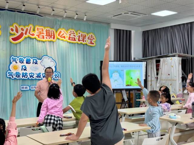 结合暑期气象灾害高发特点,苏老师重点讲解了 “雷雨、台风、高温” 三种常见气象灾害的应对方法,并通过真实案例警示大家重视防灾减灾。“2021年5月,广州全市7日凌晨遭遇历史罕见大暴雨袭击,从7日1时开始的大暴雨持续 了3到4个小时,该市南湖12小时内降水达244.3毫米。”发生这些情况我们应该如何防灾减灾呢?孩子们纷纷举手分享自己的应对方法。