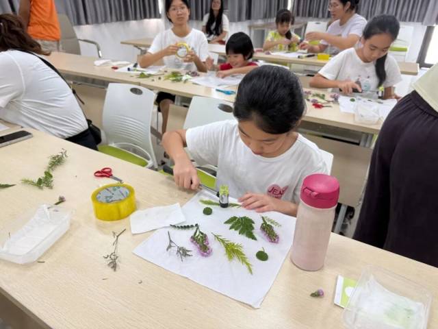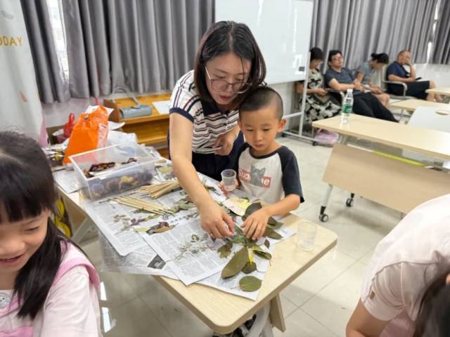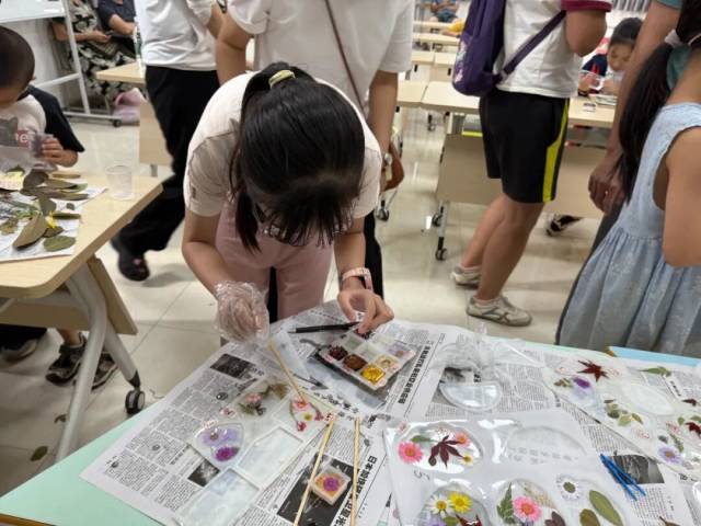 植物拓染课程中,孩子们运用天然植物材料,通过手工敲打等方式完成创作,在感受自然之美的同时,传承了传统工艺技巧,作品中蕴含的自然气息与文化韵味,成为传统文化传承的生动载体。