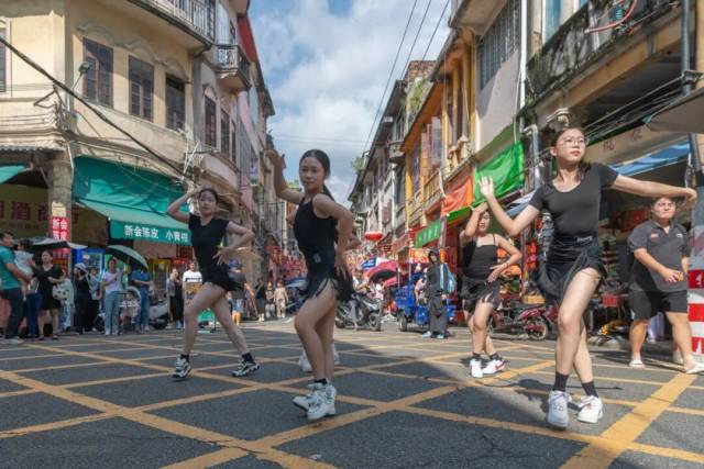 10月2日下午,“国风舞韵贺金秋”舞蹈专场接续精彩,为老街换上了翩跹的霓裳。演出在深情款款的《我和我的祖国》中拉开帷幕,舞者用肢体语言表达对祖国的真挚情感;《春述》以灵动的舞步描绘春回大地的生机勃勃;《钱鼓咚咚》将传统钱鼓与现代表演形式巧妙结合,节奏明快,引人入胜;《戏狮俏影》则融合了岭南醒狮元素,活泼俏皮,赢得满堂彩;《醉清波》以柔美的身段演绎水乡韵味,如诗如画;压轴节目《该我上场》充满青春活力,将现场气氛推向高潮。演出成为骑楼老街一道亮丽的风景线,围观的人群中不时传来“真美!”“太精彩了!”的低声赞叹。