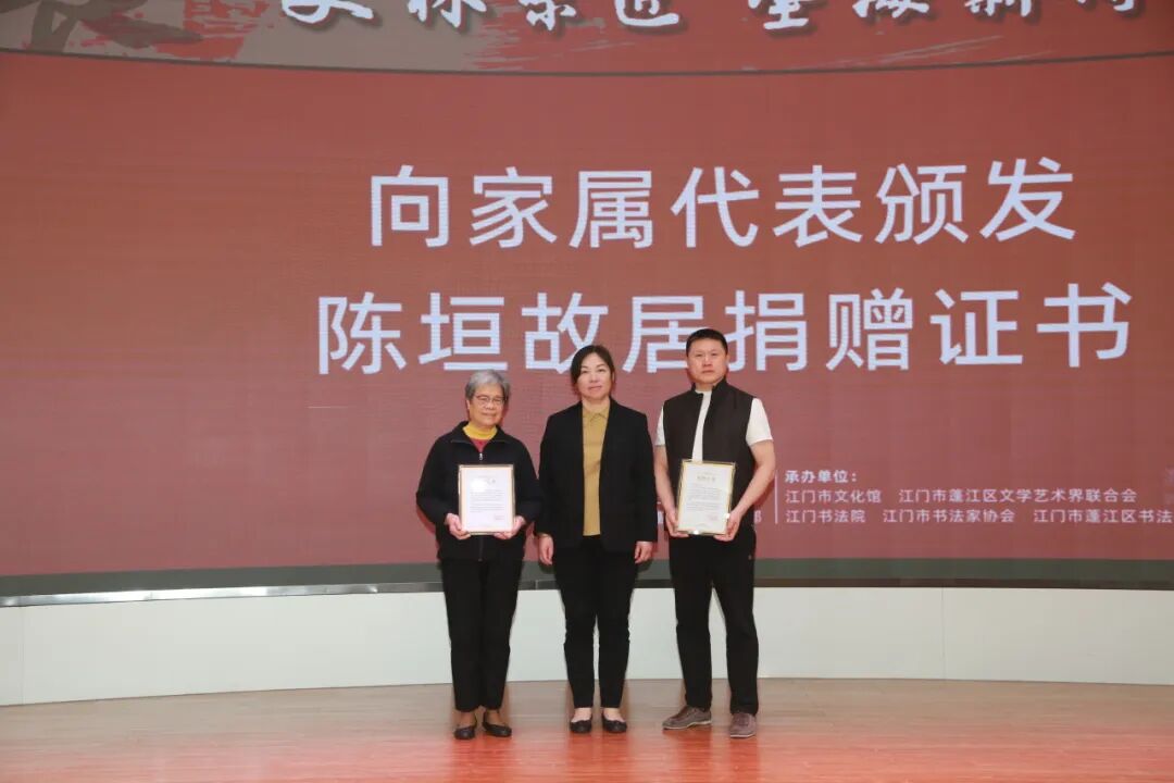 蓬江区委常委、宣传部部长梁雁仙为陈垣后人颁发陈垣故居捐赠证书