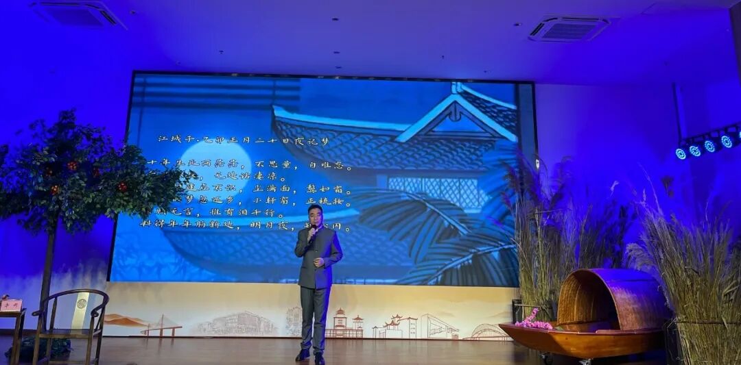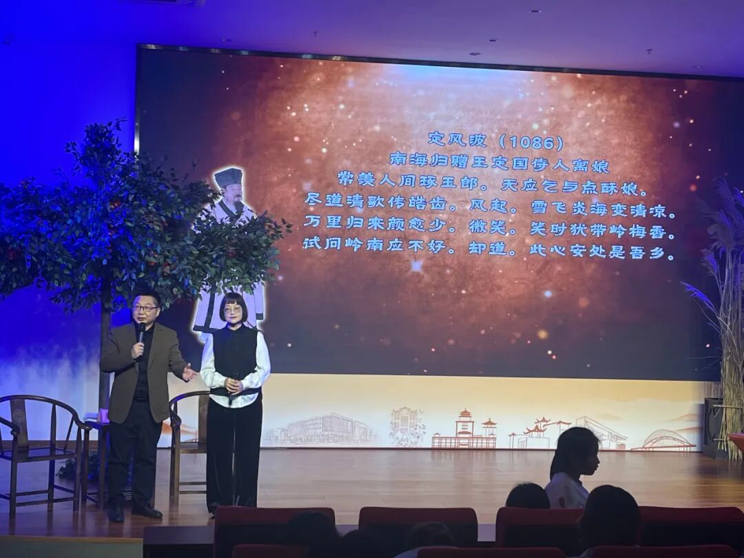 活动由资深主播陈波老师主持,并特邀江门职业技术学院古典诗词研究者李丹教授,联袂为市民读者分享苏轼与岭南的深厚渊源及其跌宕起伏的人生境遇。陈波老师率先以苏轼《自题金山画像》中的名句“问汝平生功业,黄州惠州儋州”为切入点,勾勒出苏轼波澜壮阔的一生,同时聚焦其与岭南的不解之缘,为整场活动奠定了厚重而雅致的基调。