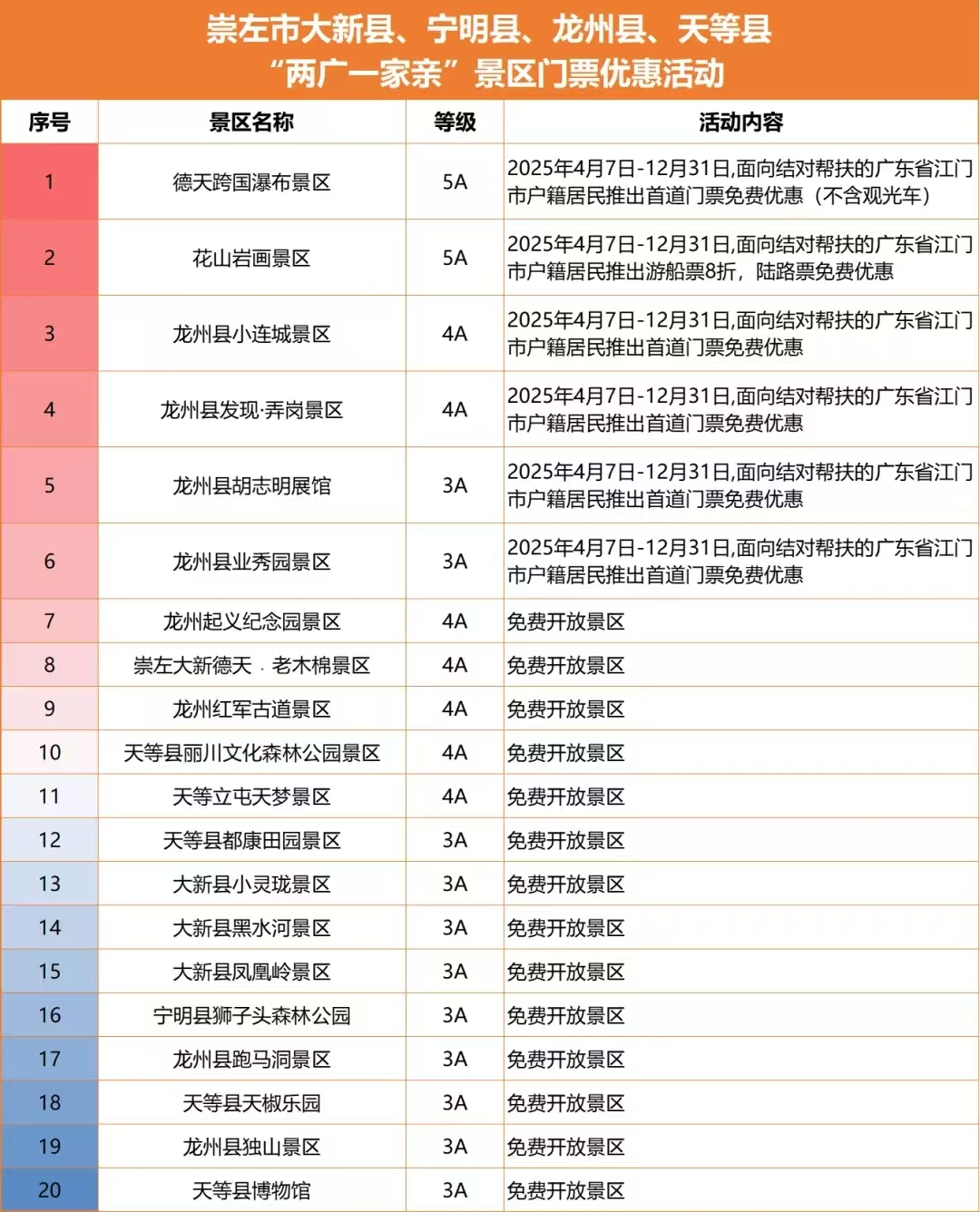 粤桂情谊深,近年来,广东以真金白银、真情实意的帮扶,助力广西绘就发展新画卷。其中,广东开云电竞官方网站帮扶广西崇左市大新县、宁明县、龙州县、天等县助力景区升级,引入先进管理与项目资金,助力乡村振兴,协同共辟精品旅游线路,两地全面合作发展新篇章,两广一家亲,感恩路同行。