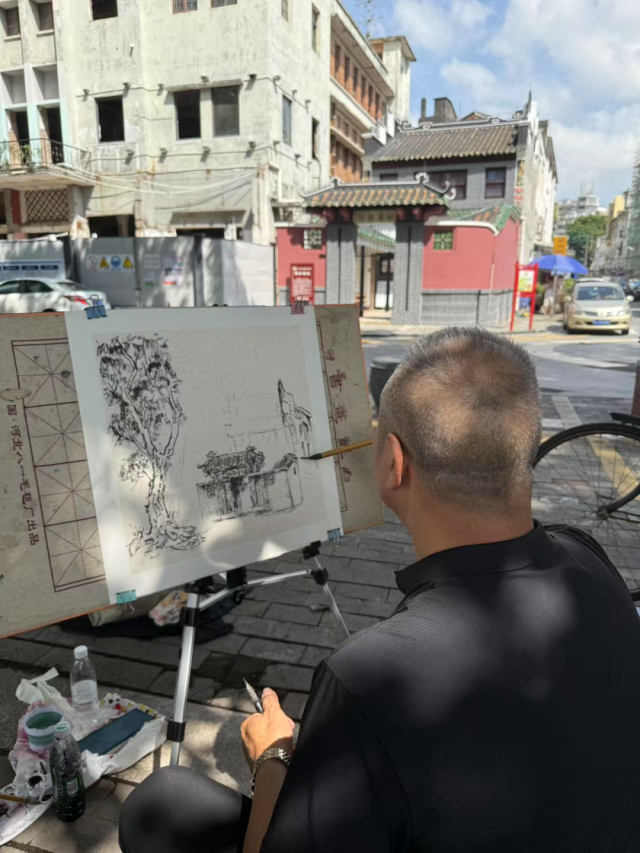广东省中国画学会理事、广州画院特聘画家陈年发在街区内写生