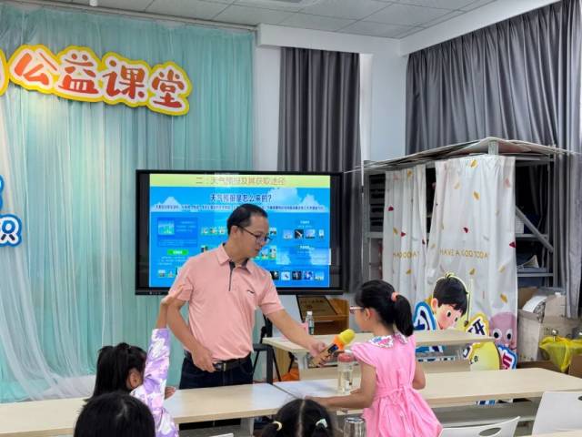 活动伊始,苏老师从“我们身边的气象”入手,用通俗易懂的语言讲解常见气象现象与气象预警信号知识。“我们每天看到的天气预报,其实藏着很多‘密码’,比如晴、阴、雨、雪的天气符号,还有不同颜色的预警信号,它们都在告诉我们未来的天气情况,帮助我们做好准备。”通过 PPT 展示了不同天气符号和气象预警信号(蓝色、黄色、橙色、红色),并且苏老师还结合了暑期常见天气场景进行解读。
