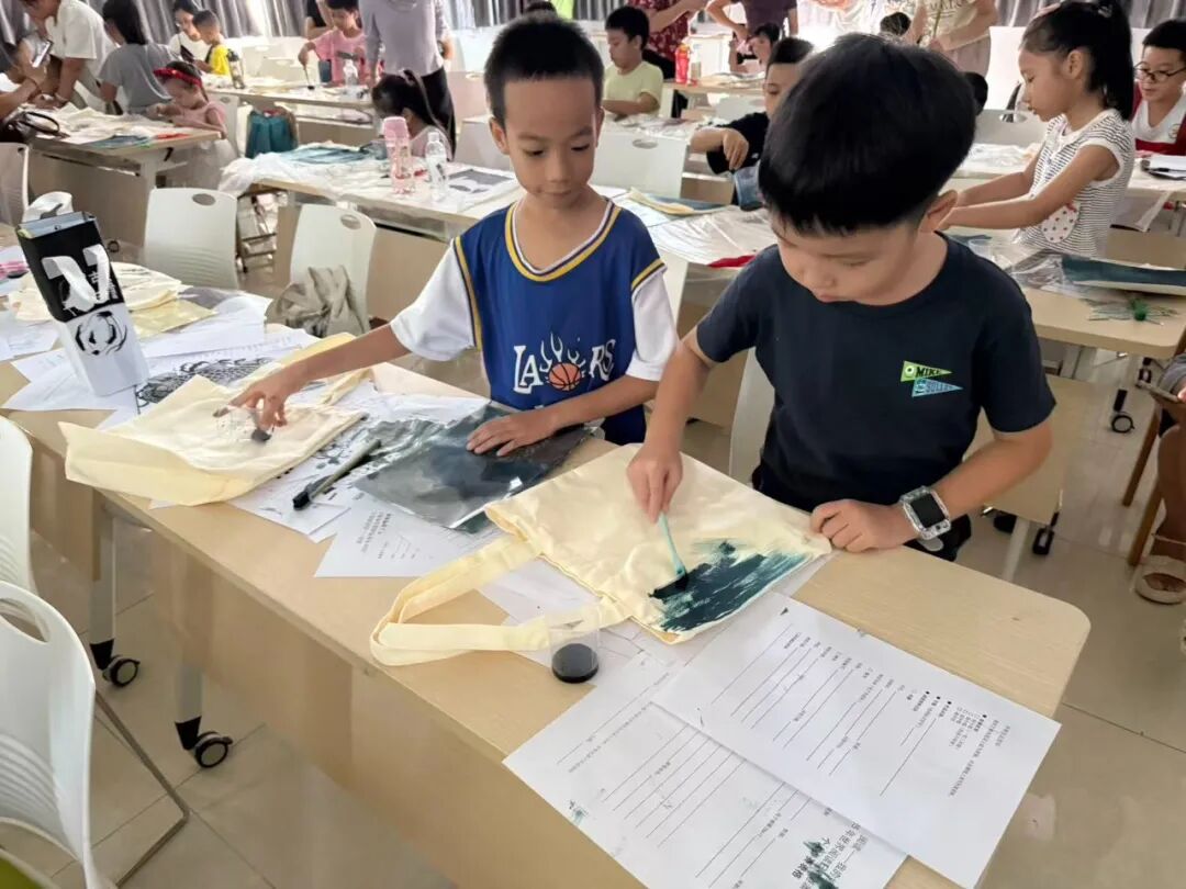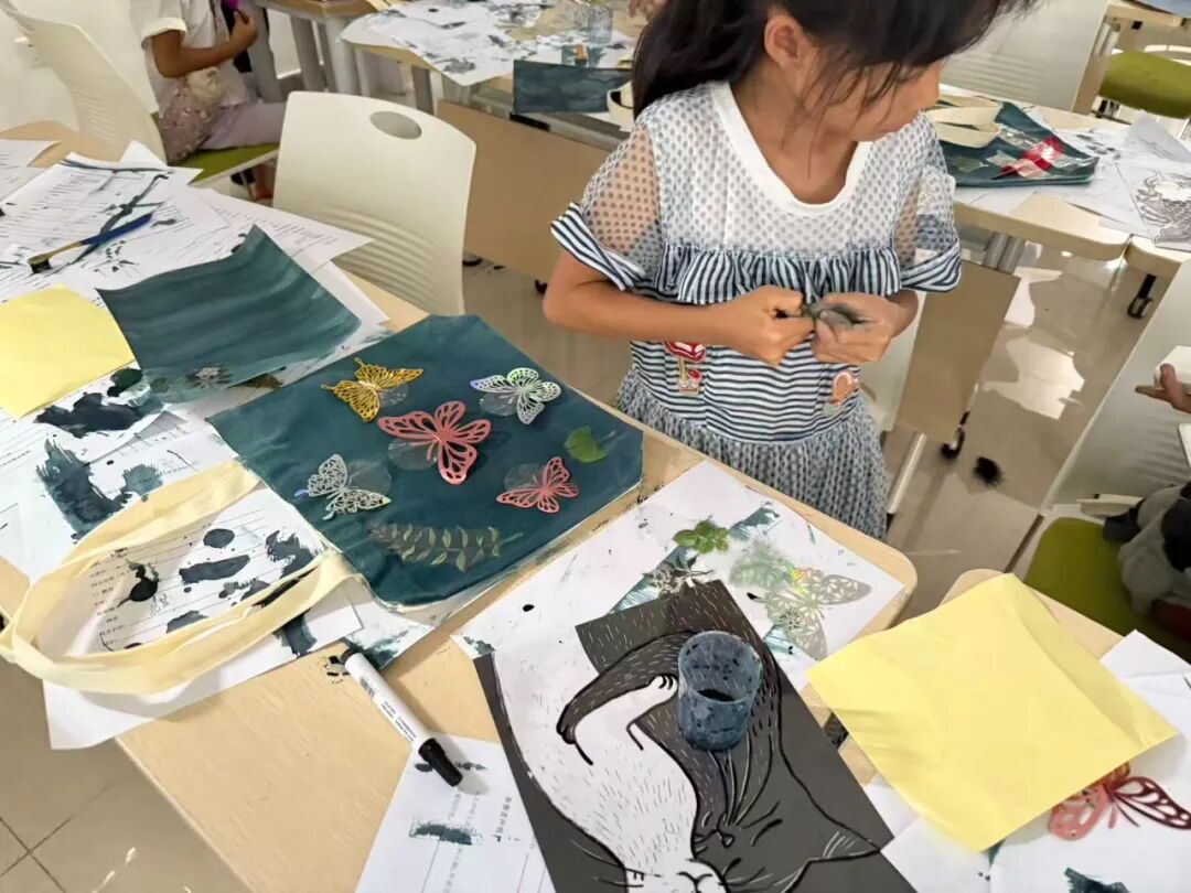 在蓝晒创作课程中,孩子们拾取林间叶片、草茎,排列于涂布蓝晒试剂的纸张。经阳光照射,纸张发生光化学反应,晕染出靛蓝色调。孩子们借此体验光影艺术,传承古法摄影工艺。成品中,靛蓝底色上自然素材纹理清晰,每道纹路都诉说着自然与人文交融的故事,成为传统文化传承的生动见证。