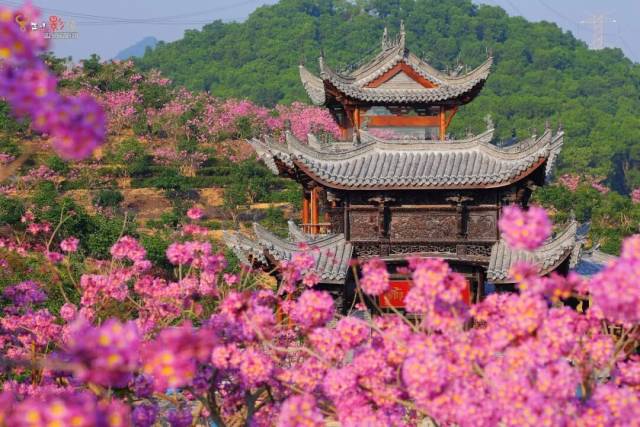 团团簇拥的粉紫色花球,挂满枝头,
