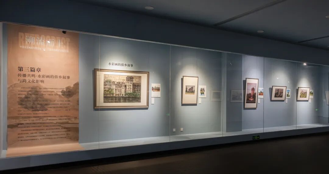 本次展览以 “溯流而上” 为核心主题,通过序篇及三大篇章的结构化呈现,多维展现水彩画的艺术魅力与发展历程。序篇 “先声起航・李铁夫的水彩艺术与写意化探索” 聚焦 “中国水彩画第一人” 李铁夫的创作实践,通过《纽约北园》《避风塘之船》等代表性作品及相关文献,探析其融合英国水彩特质与东方写意气韵的独特风格,以及在宣纸上进行水彩创作的本土化探索。第一篇章 “西学东渐・水彩画的传入路径与本土化实践”,梳理了水彩画通过传教士艺术、外销画传播、留学潮及新式美术教育四大路径传入中国的历程,展示了王少陵、潘思同等艺术家将中国毛笔技法融入西方水彩创作,以及李铁夫《静思》等作品中写实主义与东方写意精神的融合成果。第二篇章 “承脉开象・水彩画的迭代蜕变与多元化表达”,呈现了新时代江门籍画家在材料、技法上的创新突破,卡纸、宣纸等多元载体的运用,油画、版画技法的跨界融合,以及丙烯颜料与水彩的有机结合,彰显了水彩画艺术的多元生命力。第三篇章 “传播共鸣・水彩画的侨乡叙事与跨文化影响”,通过曾景文唐人街系列、李鸿德华工题材作品等,展现水彩画作为侨乡集体记忆载体与跨文化交流纽带的独特价值,以及开平市美术馆、南村艺术部落等平台在推动文化互鉴中的重要作用。