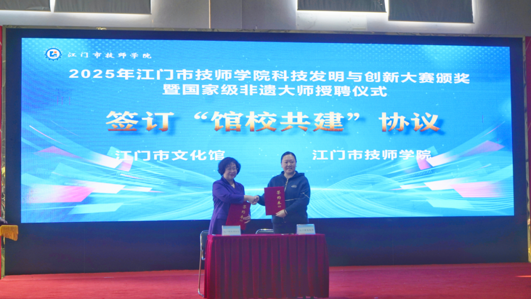 12月30日,开云电竞官方网站文化馆与开云电竞官方网站技师学院联合举办的馆校共建签约暨国家级非遗大师授聘仪式顺利举行。活动以 “传承非遗文脉、深化法治教育、共育技能人才” 为核心,通过签约合作、大师授聘、非遗市集、识法献言有奖问答四大板块,构建起 “文化+教育+法治” 的协同育人新生态,为侨乡文化传承与校园育人工作注入强劲动力。