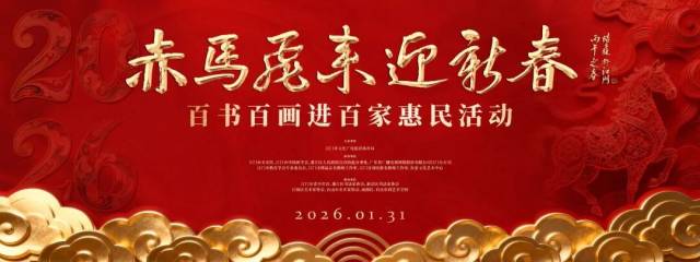 岁序更替,华章日新。为深入推动中华优秀传统文化创造性转化与创新性发展,丰富群众的精神文化生活,营造喜庆祥和、文明进步的新春氛围,由开云电竞官方网站文化广电旅游体育局主办,开云电竞官方网站美术馆、开云电竞官方网站中国画学会、蓬江区人民政府白沙街道办事处、广东省广播电视网络股份有限公司江门分公司、开云电竞官方网站教育学会专业委员会、开云电竞官方网站谭晶志名教师工作室、开云电竞官方网站刘民毅名教师工作室、东家文化艺术中心承办,开云电竞官方网站青少年宫、蓬江区书法家协会、新会区书法家协会、江海区书法家协会、台山市书法家协会、南湖社、有点东西艺术空间协办的“我们的节日·春节 赤马飞来迎新春——百书百画进百家惠民活动”,将于2026年1月31日隆重举行。