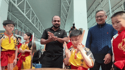 现场最引人注目的,当属江门小醒狮表演,尤其是火遍全网的8岁敲“省凳”塑料胶凳作鼓的“十猪仔”,他用棍子敲击胶凳,与小醒狮默契配合——腾空、扑跌、回旋,每一个动作都踩准鼓点,胶凳起落间迸发出明快的节奏,引得现场掌声不断。