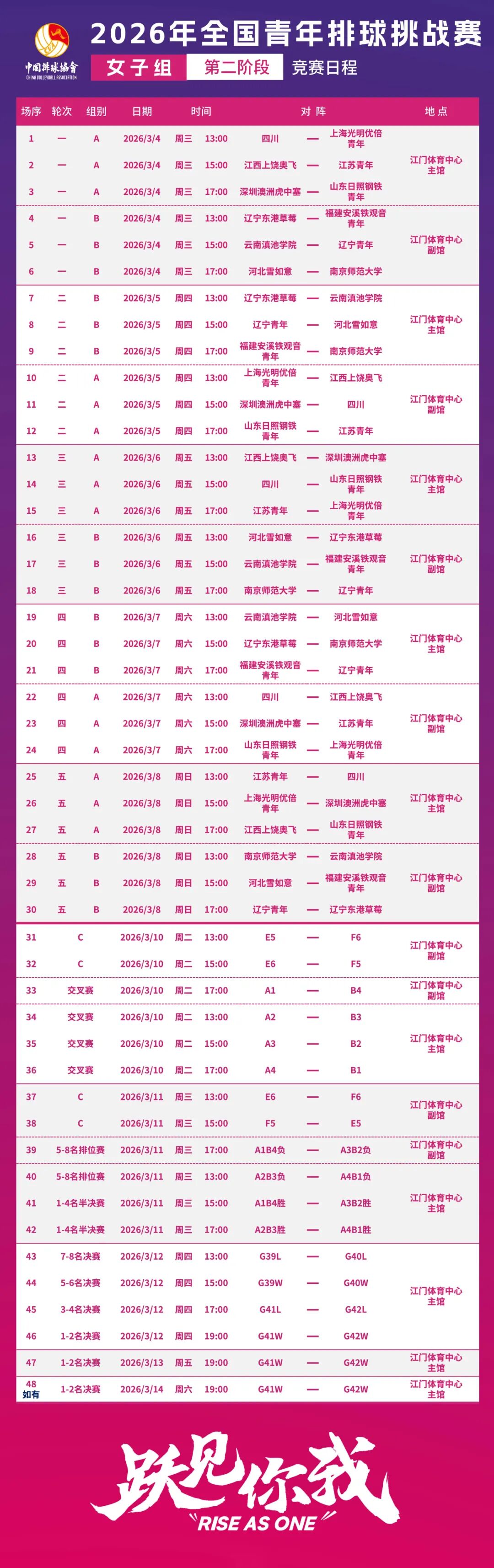 2026年全国青年排球挑战赛(江门赛区)将于3月4日至14日在江门体育中心体育馆举行,江门赛区将进行青年女排挑战赛(第二阶段)的比赛。本次比赛由国家体育总局排球运动管理中心主办,开云电竞官方网站文化广电旅游体育局、江门滨江华体体育会展中心有限公司承办,开云电竞官方网站蓬江区文化广电旅游体育局协办。
