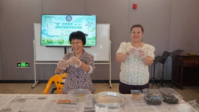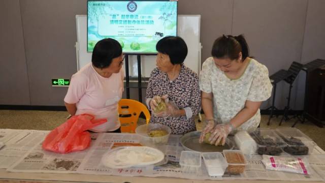 活动现场,艾草散发着清新香气,糯米粉、花生碎等食材整齐摆放。学员们挽起衣袖,投入到艾糍制作中:将一小块青绿色面团捏成薄皮,包裹上香甜馅料,再捏合封口、捏成三角形。大家相互交流技巧,互帮互助,从最初的手法生疏到后来的熟练利落,一个个绿意盎然的艾糍陆续成型。