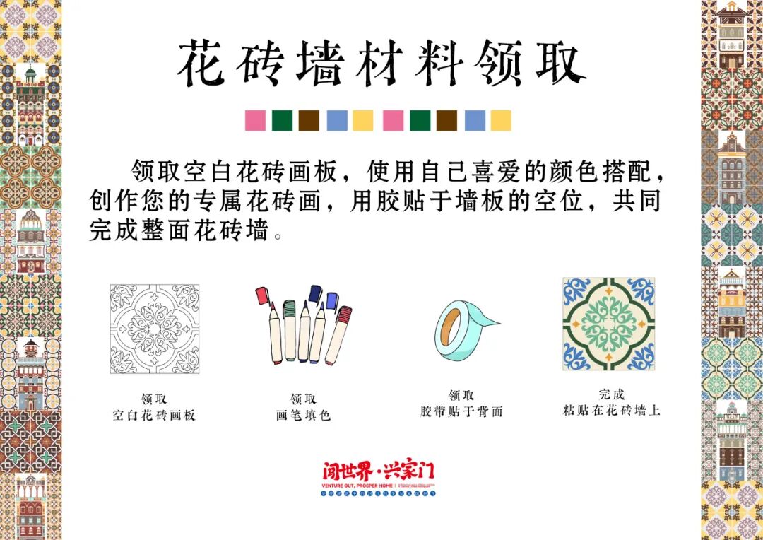 观众可在展览出口外的西门前台领取一份侨乡花砖空白画板(每日限量供应,先到先得),可以参照展厅内的历史原件,也可以根据个人喜好进行填色创作。完成后,请亲手将您的作品贴在展厅出口处的空白花砖墙上。