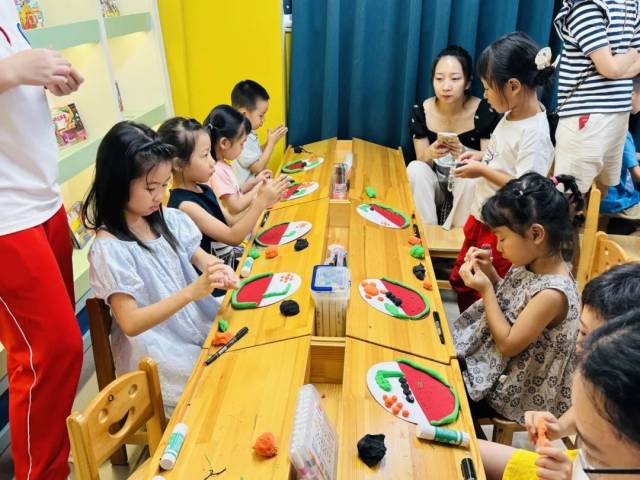 为了让孩子们更深刻地理解故事内容,激发他们的创造力,我们在故事结束后安排了一项延伸活动——黏土创意手工。桌上摆满了五颜六色的黏土材料,孩子们在父母的帮助下,开始了天马行空的艺术创作。有的小朋友捏出了可爱的蚂蚁形象,有的则尝试制作一片片栩栩如生的西瓜。通过亲手触摸、塑造这些形象,孩子们不仅能更好地理解和记忆故事中的细节,还能培养动手能力和艺术感知力。