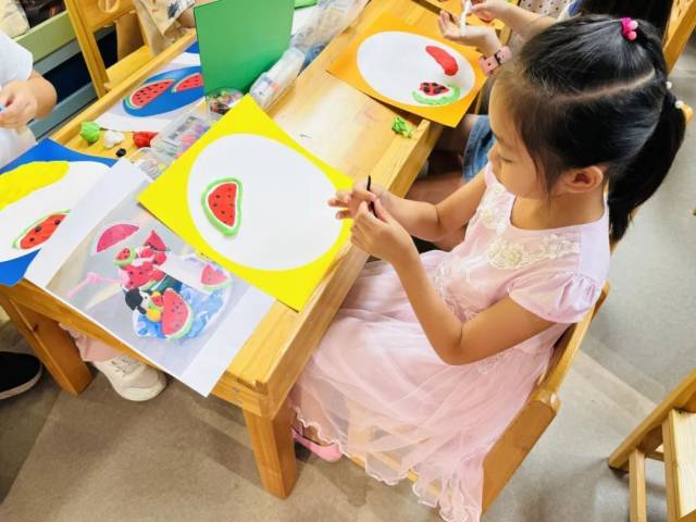 到了创意表达时间,小朋友们更是大展身手。他们拿起画笔和彩纸,将心中的想象一一呈现。有的画出了小鳄鱼在西瓜田里畅游的画面,有的则画出了自己和小鳄鱼一起分享西瓜的温馨场景。每一幅作品都充满了童趣和创意,让人忍不住想要多看几眼。