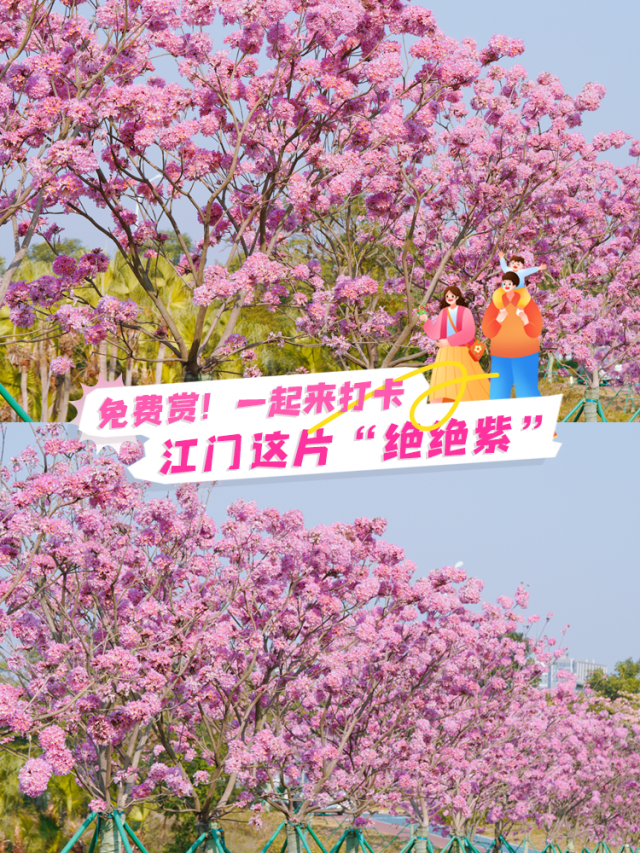 今天我请客请大家赏浪漫紫色花海生活在江门这座城市,一年四季都有惊喜——这不,江门又有新的花海开放啦!那就是——紫花风铃木。近日,江门站前的紫花风铃木盛开,静静驻足观赏,沉浸于梦幻色彩中,心情瞬间被治愈。抬头一望,你就可以看见紫粉的花球挂在枝头,与蔚蓝的天空交相辉映,令人陶醉。再咔嚓按下快门,就可以拍出一张美美的照片了。花海免费参观,趁着阳光灿烂,快换上美美的服装,拍出大片啦。