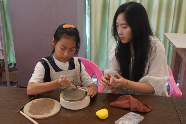 在中山古建筑陶塑瓦脊制作技艺体验课现场,何晓桦老师及助理梁老师其深入浅出地介绍了小榄非遗项目“古建筑陶塑瓦脊制作技艺”的传承背景、发展历程和文化内涵,并现场示范创作陶艺作品和传授制陶技艺。学员们跟随传承人分步操作:将特质陶土揉捻成细腻泥团,用竹刀在坯体上雕刻出卷草纹的起伏肌理,再以模具压印出瓦当的云纹轮廓。泥土是一种拥有造物般神奇魔法的天然材料,现场参与者在平凡的陶泥中发挥天马行空的想象力,通过一双双巧手打造,制出了一件件富有自己思想感情的半成品。