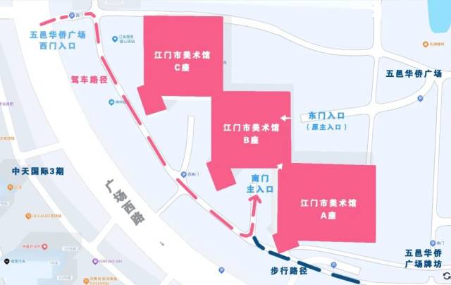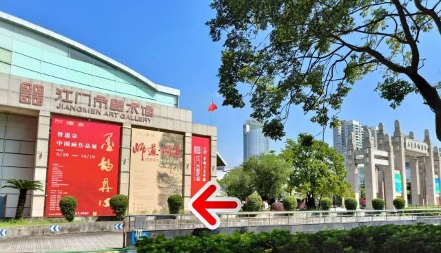 开云电竞官方网站美术馆-南门主入口位置参考:由开云电竞官方网站五邑华侨广场西门入口处右转前行约200米即可抵达,此处正对中天国际3期,与华侨广场公交站直线距离约100米。