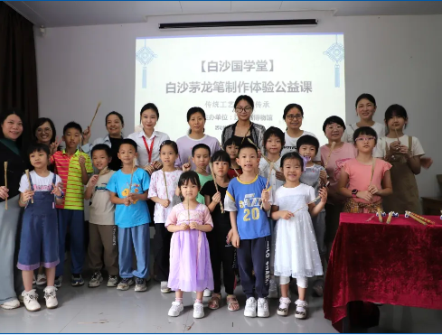 在多媒体室,茅龙笔制作体验活动亦是热火朝天。在工作人员的讲解介绍和实践示范下,参与者们认识了白沙茅龙笔的历史、特点和制作过程,并亲自动手制作体验了茅龙笔制作的主要步骤。参与活动的家长和小朋友们均表示此次活动既有意义又有趣,希望后续还会有类似活动。
