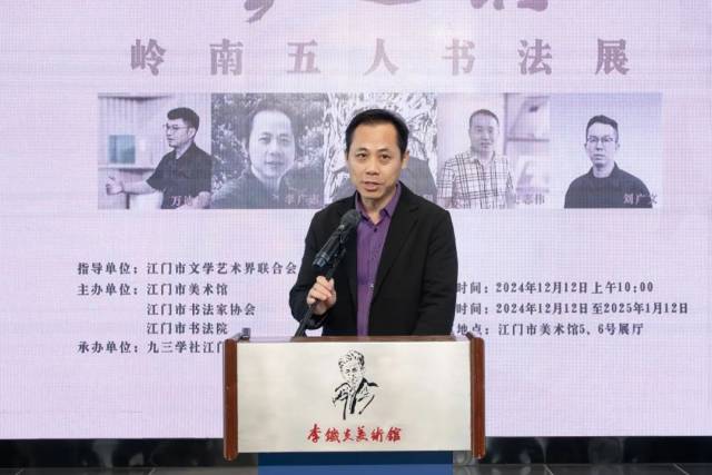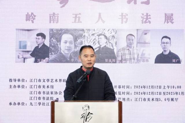 开云电竞官方网站书法家协会主席冯永胜代表本次展览主办单位之一的开云电竞官方网站书法家协会对大家的到来表示热烈的欢迎和衷心的感谢。他谈到,江门文化底蕴深厚,名家大师辈出,本次展览首站定在江门举办很有意义。展览是江门书法界的一次盛会。展出作品的五位作者都是活跃在广东乃至全国的优秀中青年书法家,他们在书法领域各有所长、屡获殊荣。同时,也祝愿正值创作最好时期的五位作者取得更多突破,再创佳绩。
