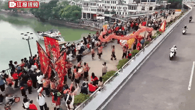 龙狮竞相欢舞,分头在南北岸热闹出巡