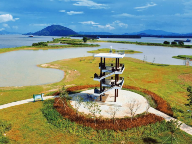 园区设置观景广场、景观漫步道、观鸟楼、停车场、驿站等。登上中央的观鸟楼,近看是三江汇流的磅礴景色,远处是层层山峦,还可以360°环视整个湿地公园,把候鸟与江景尽收眼底。