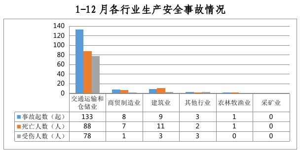 全市共发生生产安全事故154起,其中交通运输和仓储业133起、占86%,商贸制造业8起、占5%,建筑业9起、占6%,其他行业3起、占2%,农林牧渔业1起、占1%。采矿业未发生生产安全事故。