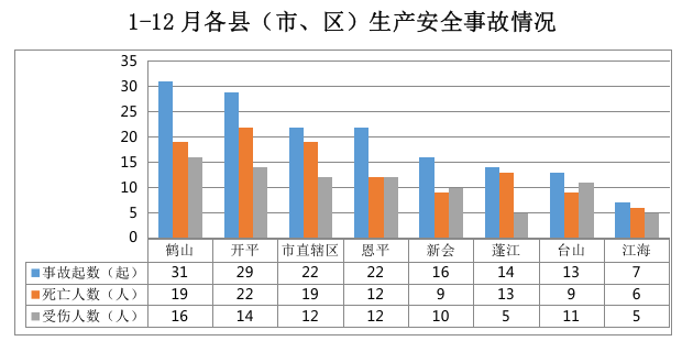 全市发生生产安全事故145起:鹤山31起,开平29起,市直辖区22起,恩平22起,新会16起,蓬江14起,台山13起,江海7起。