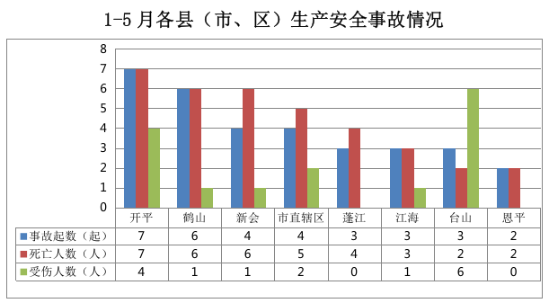开平事故7起,鹤山事故6起,新会事故4起,市直辖区事故4起,蓬江事故3起,江海事故3起,台山事故3起,恩平事故2起。