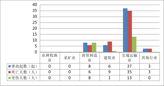全市共发生生产安全事故54起,其中商贸制造业8起、占15%,建筑业6起、占11%,交通运输业37起、占69%,其他行业3起、占5%。农林牧渔业和采矿业未发生生产安全事故。
