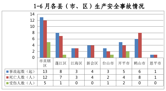 市直辖区事故13起,蓬江区事故8起,江海区事故3起,新会区事故4起,台山市事故3起,开平市事故5起,鹤山市事故6起,恩平市事故1起。