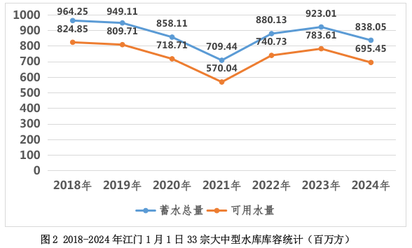 表2 2018-2024年江门1月1日33宗大中型水库库容统计(百万方)