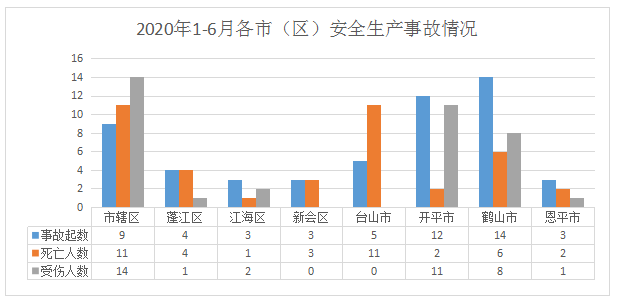 1-6月,市辖区发生交通运输和仓储业事故9起(其中道路运输和仓储业7起、水上运输2起);蓬江区发生事故4起(其中建筑业1起、交通运输和仓储业3起);江海区发生交通运输和仓储业事故3起;新会区发生事故3起(其中交通运输和仓储业2起、商贸制造业行业1起);台山市发生事故5起(其中农林牧渔业1起、其他行业1起、交通运输和仓储业3起);开平市发生交通运输和仓储业事故12起;鹤山市发生事故14起(其中商贸制造业1起、交通运输和仓储业12起、其他行业1起);恩平市发生事故3起(其中商贸制造业1起、交通运输和仓储业2起)。
