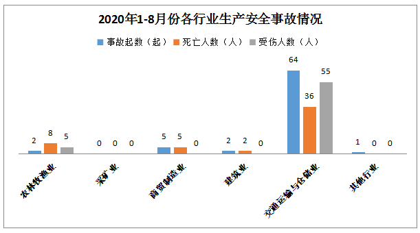 1-8月,全市共发生生产安全事故74起,其中农林牧渔业2起、商贸制造业5起,建筑业2起,交通运输和仓储业64起,其他行业1起。