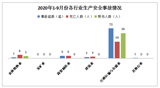 1-9月,全市共发生生产安全事故82起,其中农林牧渔业2起、商贸制造业6起,建筑业3起,交通运输和仓储业70起,其他行业1起。