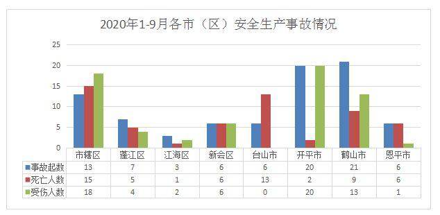 1-9月,市辖区1发生交通运输和仓储业事故13起(其中道路运输11起、水上运输2起);蓬江区发生事故7起(其中商贸制造业1起、建筑业1起、交通运输和仓储业5起);江海区发生交通运输和仓储业事故3起;新会区发生事故6起(其中农林牧渔业1起、商贸制造业1起、交通运输和仓储业3起、其他事故1起);台山市发生事故6起(其中农林牧渔业1起、交通运输和仓储业5起);开平市发生交通运输和仓储业事故20起;鹤山市发生事故21起(其中商贸制造业2起、交通运输和仓储业18起、其他行业1起);恩平市发生事故6起(其中商贸制造业1起、建筑业2起、交通运输和仓储业3起)。