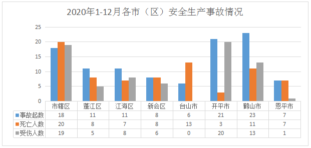 1-12月,市辖区1发生交通运输和仓储业事故18起(其中道路运输15起、水上运输3起);蓬江区发生事故11起(其中商贸制造业3起、建筑业2起、交通运输和仓储业6起);江海区发生交通运输和仓储业事故11起;新会区发生事故8起(其中农林牧渔业1起、商贸制造业2起、建筑业1起、交通运输和仓储业4起);台山市发生事故6起(其中农林牧渔业1起、交通运输和仓储业5起);开平市发生交通运输和仓储业事故21起;鹤山市发生事故23起2(其中商贸制造业3起、建筑业1起、交通运输和仓储业18起、其他行业1起);恩平市发生事故7起(其中商贸制造业1起、建筑业2起、交通运输和仓储业4起)。