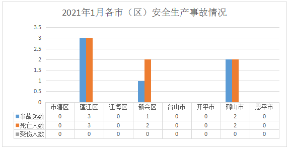 1月,蓬江区发生事故3起(其中建筑业2起、交通运输和仓储业1起);新会区发生交通运输和仓储业事故1起;鹤山市发生事故2起(其中商贸制造业1起、交通运输和仓储业1起);市辖区1、江海区、台山市、开平市和恩平市均未有生产安全事故发生。
