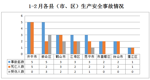 1-2月,市直辖区发生事故2起(其中道路运输事故1起、水上运输事故1起);蓬江区发生交通运输和仓储业事故1起;江海区发生交通运输和仓储业事故3起;新会区发生交通运输和仓储业事故5起;台山市发生事故2起(其中商贸制造业事故1起、交通运输和仓储业事故1起);开平市发生交通运输和仓储业事故5起;鹤山市发生交通运输和仓储业事故3起;恩平市发生交通运输和仓储业事故3起。