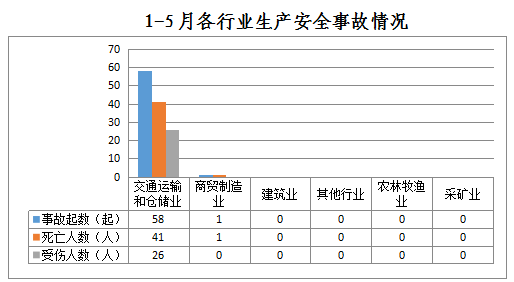 1-5月,全市共发生生产安全事故59起,其中交通运输和仓储业58起、占98%;商贸制造业1起,占2%;农林牧渔业、采矿业、建筑业和其他行业未发生生产安全事故。