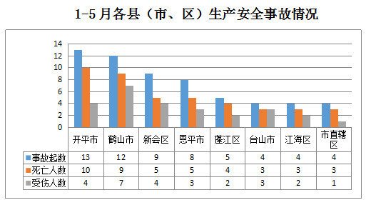 1-5月,市直辖区发生事故4起(其中道路运输事故3起、水上运输事故1起);蓬江区发生交通运输和仓储业事故5起;江海区发生交通运输和仓储业事故4起;新会区发生交通运输和仓储业事故9起;台山市发生事故4起(其中商贸制造业事故1起、交通运输和仓储业事故3起);开平市发生交通运输和仓储业事故13起;鹤山市发生交通运输和仓储业事故12起;恩平市发生交通运输和仓储业事故8起。