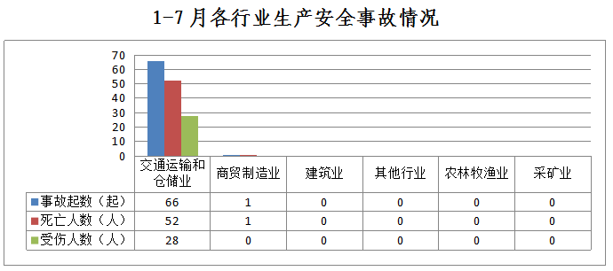 1-7月,全市共发生生产安全事故67起,其中交通运输和仓储业66起、占99%;商贸制造业1起,占2%;农林牧渔业、采矿业、建筑业和其他行业未发生生产安全事故