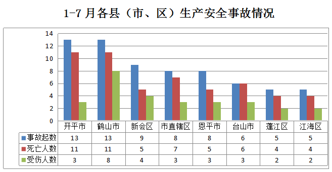 1-7月,开平市发生交通运输和仓储业事故13起;鹤山市发生交通运输和仓储业事故13起;新会区发生交通运输和仓储业事故9起;市直辖区发生事故8起(其中道路运输事故6起、水上运输事故2起);恩平市发生交通运输和仓储业事故8起;台山市发生事故6起(其中商贸制造业事故1起、交通运输和仓储业事故5起);蓬江区发生交通运输和仓储业事故5起;江海区发生交通运输和仓储业事故5起。