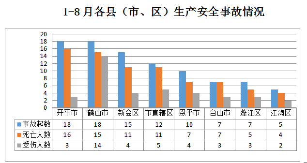 1-8月,开平市发生交通运输和仓储业事故18起;鹤山市发生交通运输和仓储业事故18起(其中商贸制造业事故1起、交通运输和仓储业事故17起);新会区发生交通运输和仓储业事故15起;市直辖区 发生事故12起(其中道路运输事故9起、水上运输事故3起);恩平市发生交通运输和仓储业事故10起;台山市发生事故7起(其中商贸制造业事故1起、交通运输和仓储业事故6起);蓬江区发生交通运输和仓储业事故7起;江海区发生交通运输和仓储业事故5起。