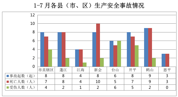市直辖区事故8起,蓬江事故8起,江海事故4起,新会事故8起,台山事故6起,开平事故8起,鹤山事故9起,恩平事故3起。
