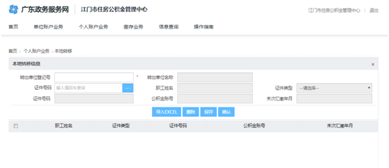 (4)导入EXCEL文件需校验转出单位登记号、 转入单位登记号、转移职工人数是否一致;校验姓名、证件号、证件类型、公积金账号是否存在,是否为转出单位的职工。