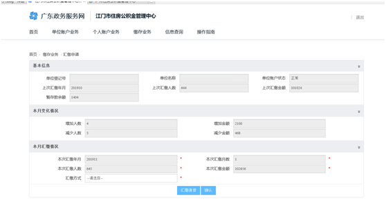 单位汇缴申请流程:点击“汇缴申请”-确认汇缴信息是否正确-确认申请。