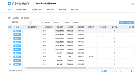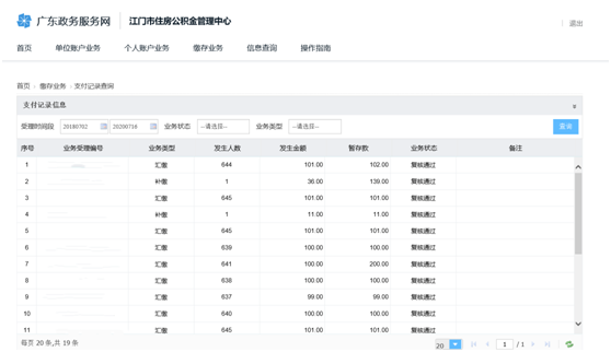 (1)录入查询条件:受理日期、业务类型、业务状态;查询结果: 详情(操作按钮)、业务受理编号、业务流水号、业务类型、业务状态、记账日期、汇缴年月、发生金额、发生人数、备注信息、来源渠道、操作时间、操作人员、审批时间、审批意见;
