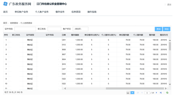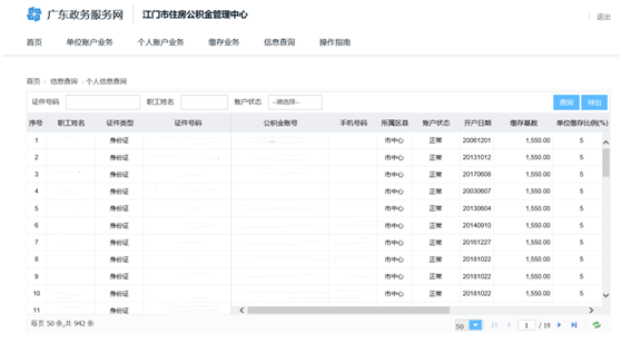 显示正常和封存状态职工的缴存信息。包括,姓名、证件类型、证件号码、公积金账号、手机号码、所属区县、账户状态,开户日期、缴存基数、单位缴存比例、个人缴存比例、单位缴存额、个人缴存额、缴存额、缴至年月。